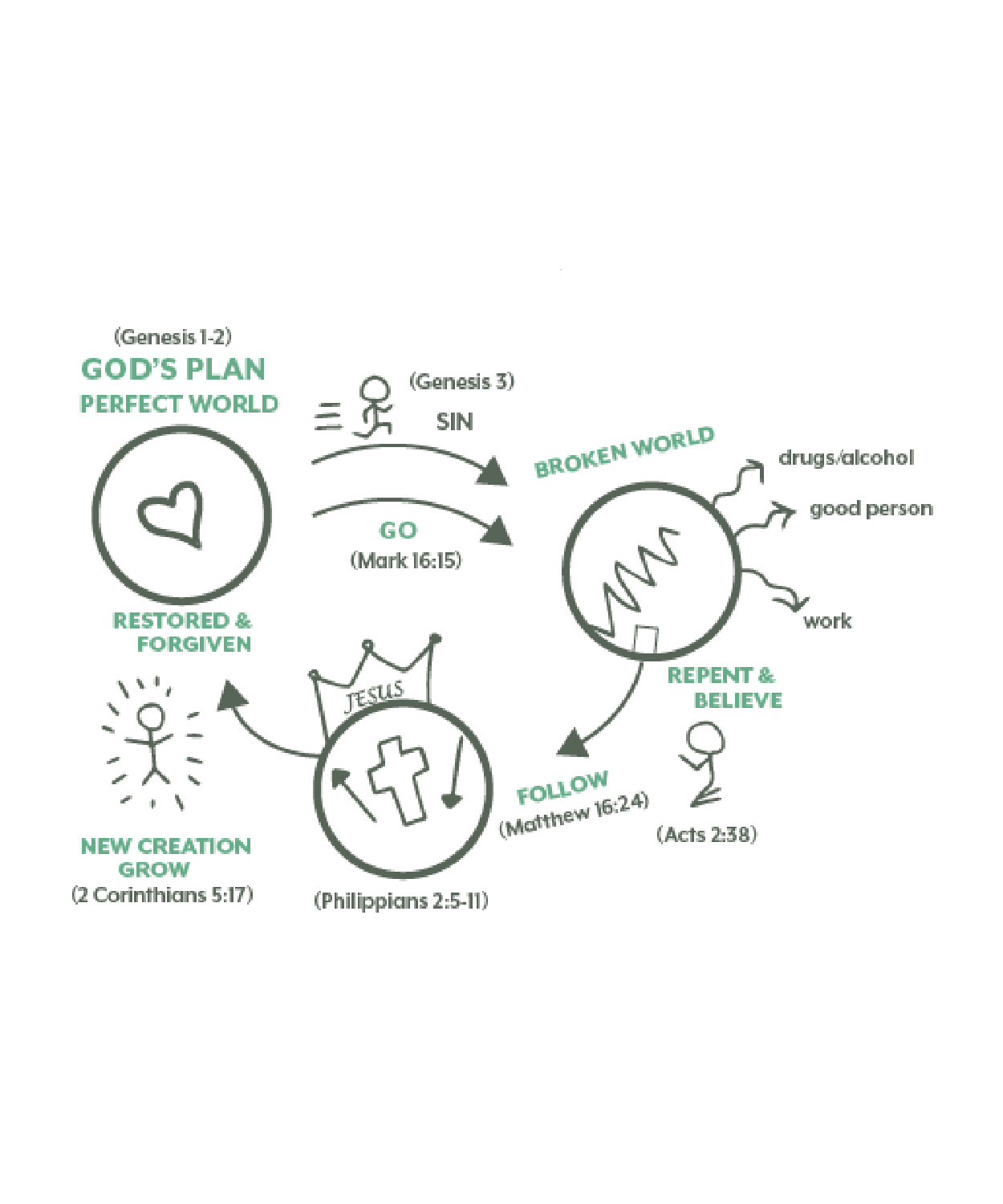 God had a plan to restore us, which is why we learn about the third circle. Now Jesus, He IS God and He came down into our broken world, He didn’t know sin and was the perfect sacrifice for our sins because he never sinned. He was willing to die on the cross to be the perfect sacrifice for our sins. And then three days later He rose from the dead to restore us back to God’s perfect design. Now Jesus tells us, no matter who we are, how we can get back to God. He tells us to do two things. First, He tells us to turn from our sin and living life our own way and believe in His work on the cross. Second, He tells us to choose to follow Jesus and make Him our Lord. If we choose to turn and follow, then we can come to Jesus and if we do that, then He promises to restore us back to His design.